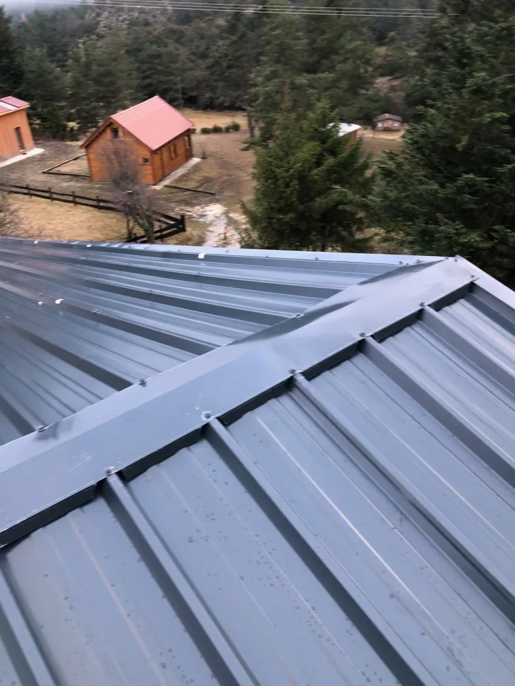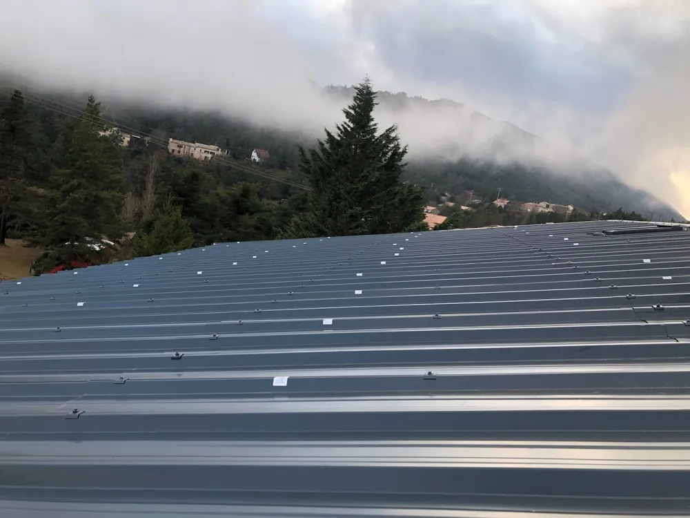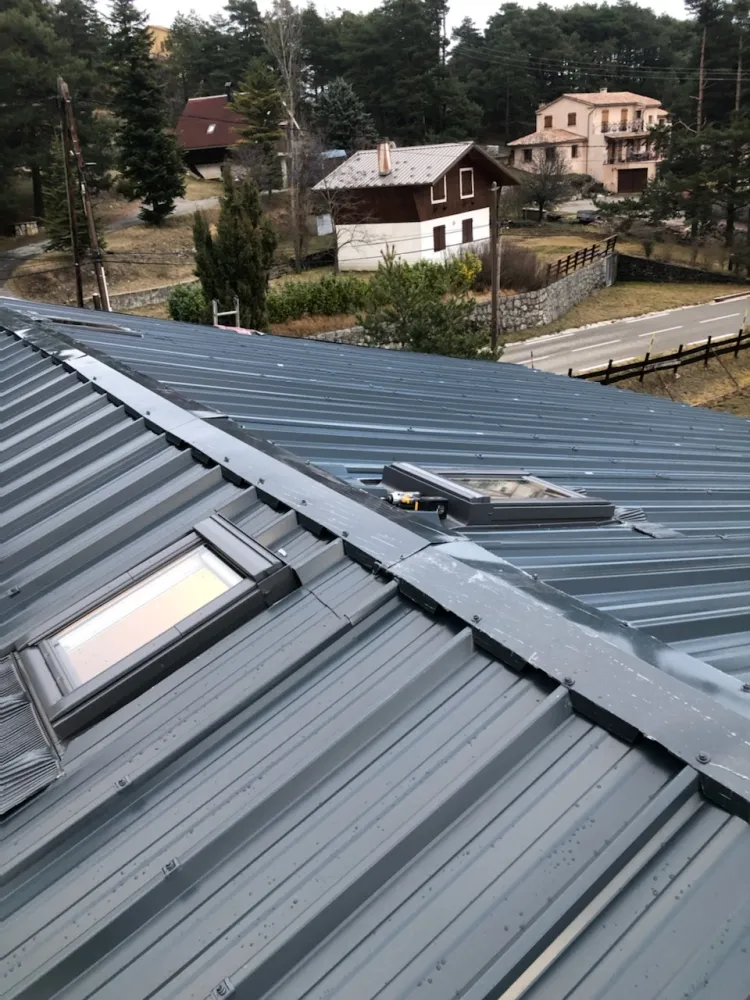 Pose de bac acier avec fenêtres de toit type Velux a Andon, kit d'étanchéité complet, gouttières avec descentes et coudes, étanchéité bitumineux et écran sous-toiture.